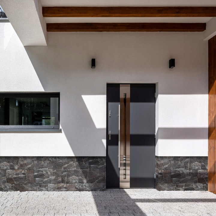 Neutralne odcienie szarości ułatwiają dopasowanie kamienia do jasnych i ciemnych aranżacji. Materiał wyraźnie akcentuje bryłę budynku i nadaje jej prestiżowy charakter. Montaż bez fugowania pozwala szybko uzyskać jednolitą, estetyczną powierzchnię i znacząco skraca czas prac.