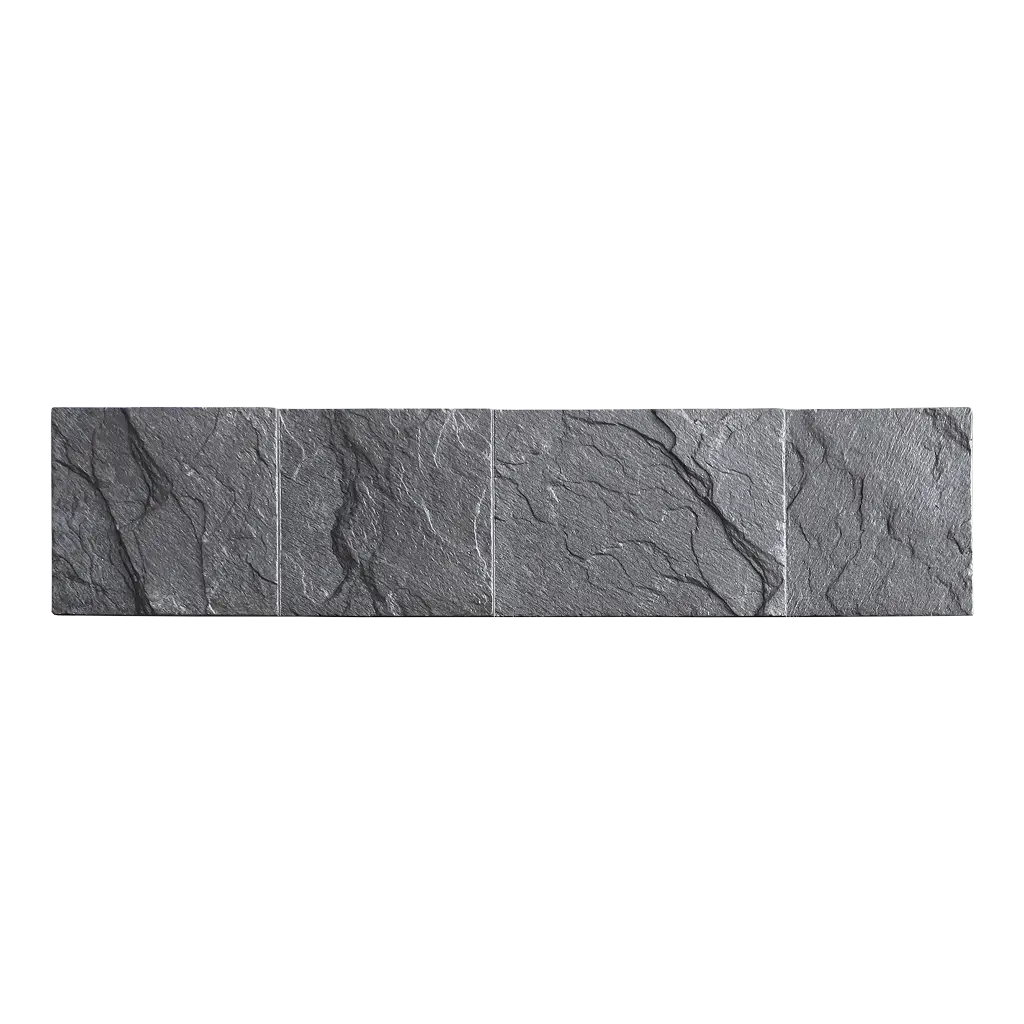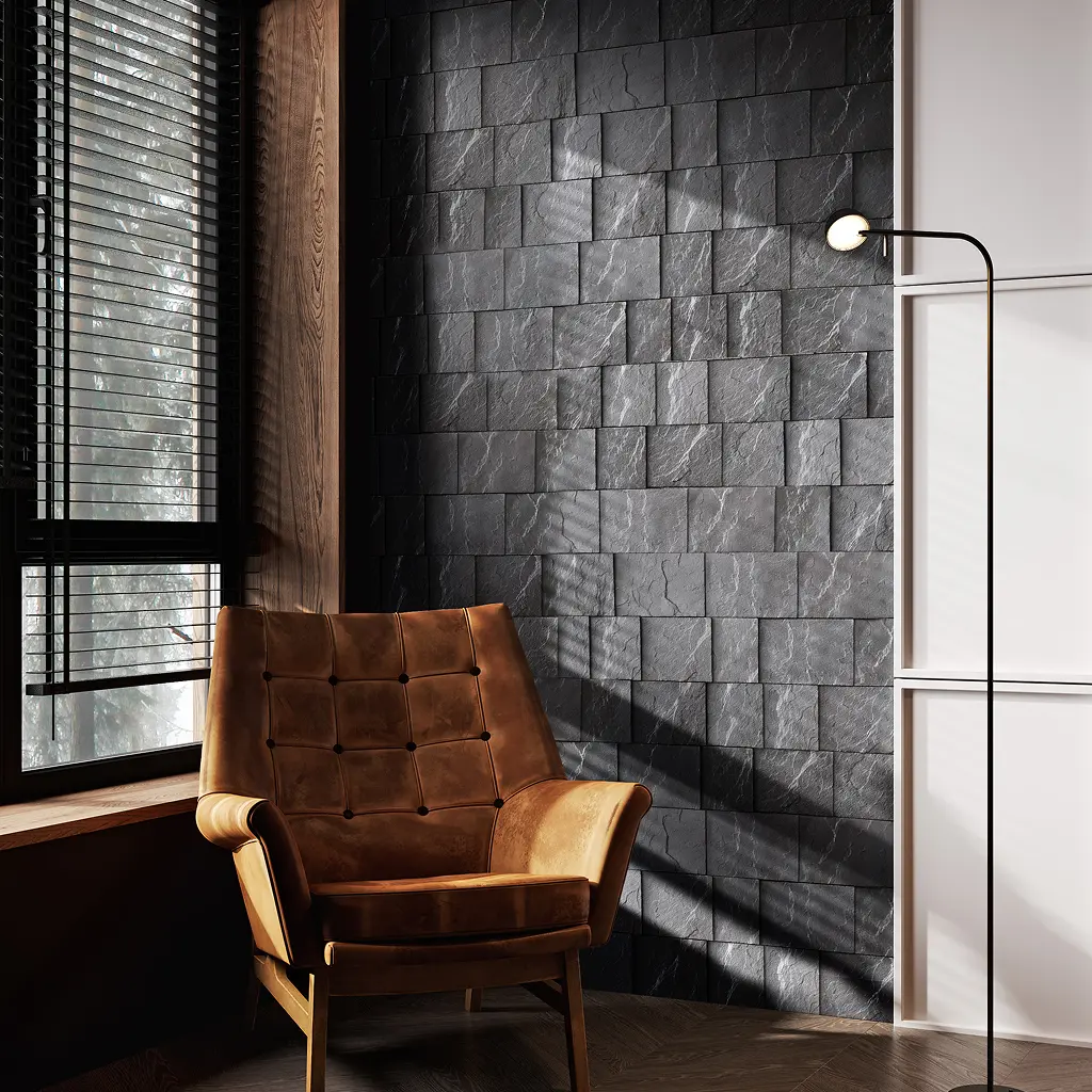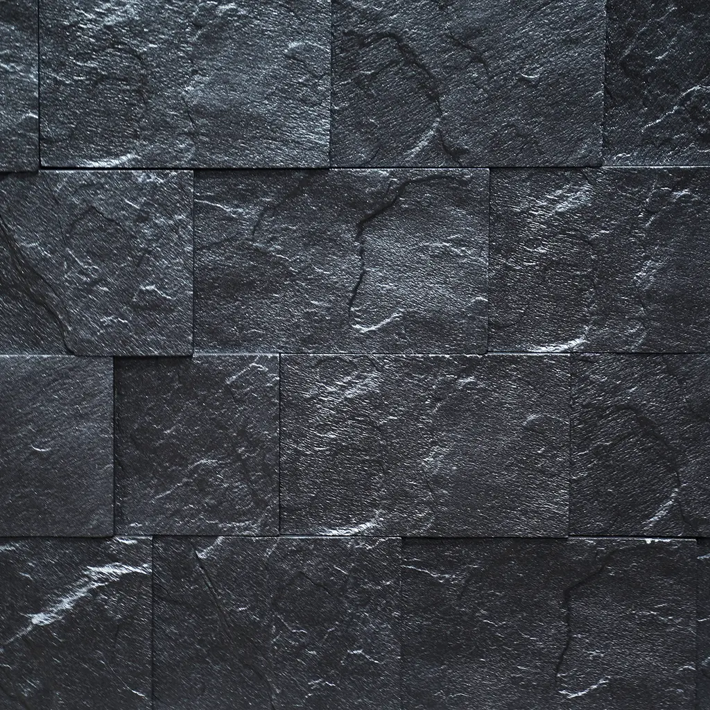 Dekoracyjny kamień elewacyjny o głębokim, grafitowym kolorze i strukturze inspirowanej naturalnym łupkiem. Stylowy akcent do wnętrz i elewacji.