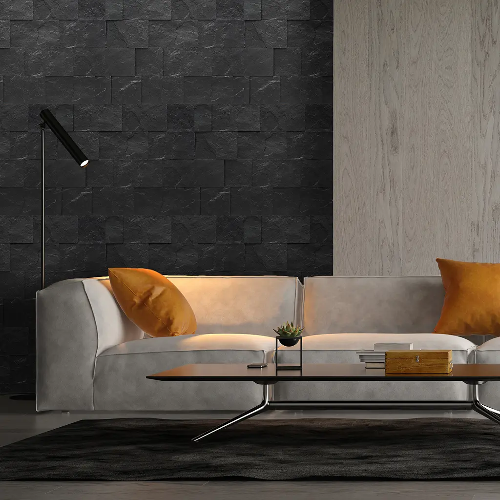 Grand Nero to elegancki kamień elewacyjny, który zachwyca grafitową barwą i strukturą wiernie odwzorowującą naturalny łupek. Nieregularna forma oraz wyrazista, trójwymiarowa powierzchnia nadają ścianom surowy, a zarazem nowoczesny charakter z wyczuwalną głębią.