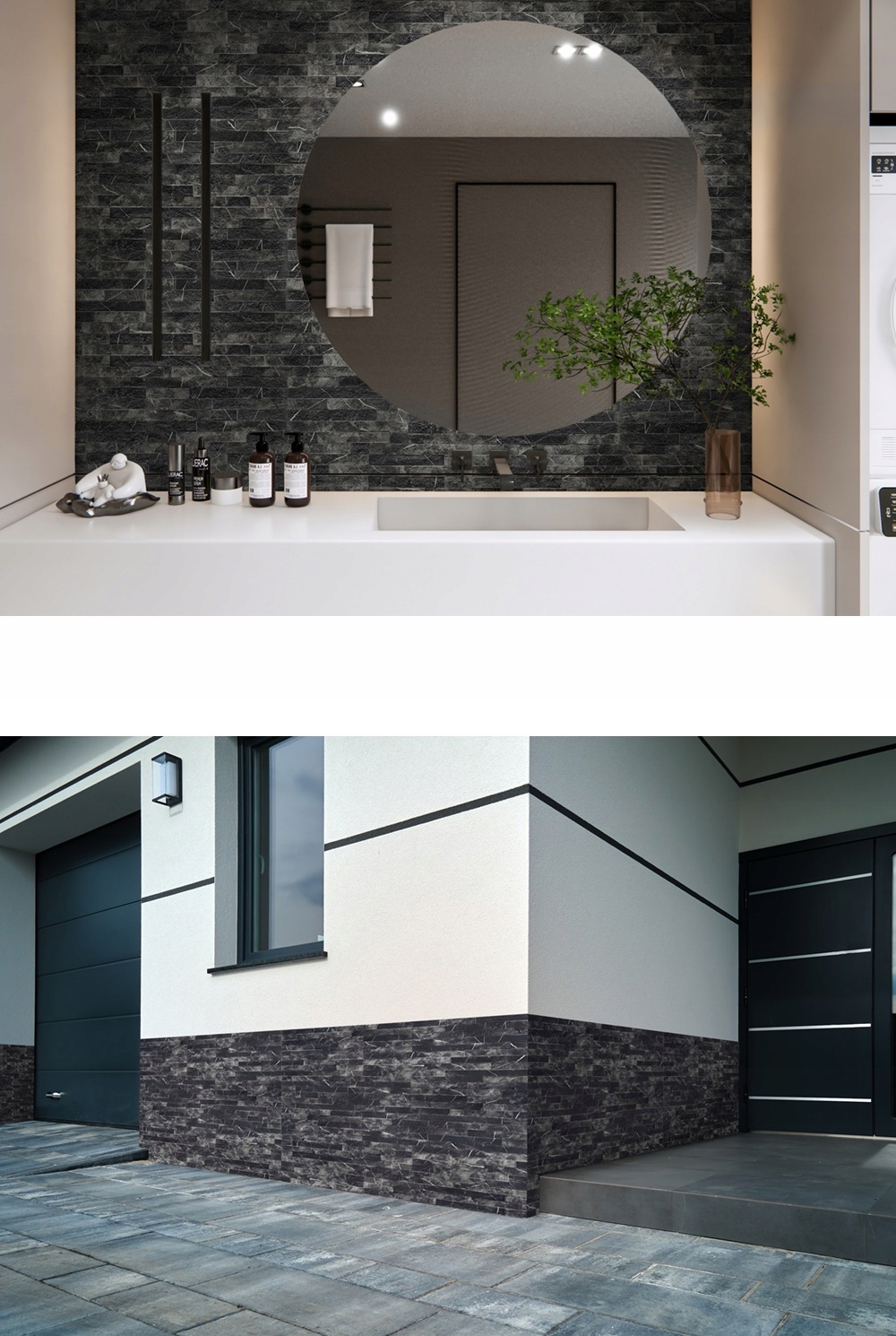 - Wszechstronnością użycia – sprawdza się idealnie na zewnątrz i wewnątrz, w tym na elewacjach, w przestrzeni mieszkalnej oraz w elementach małej architektury.