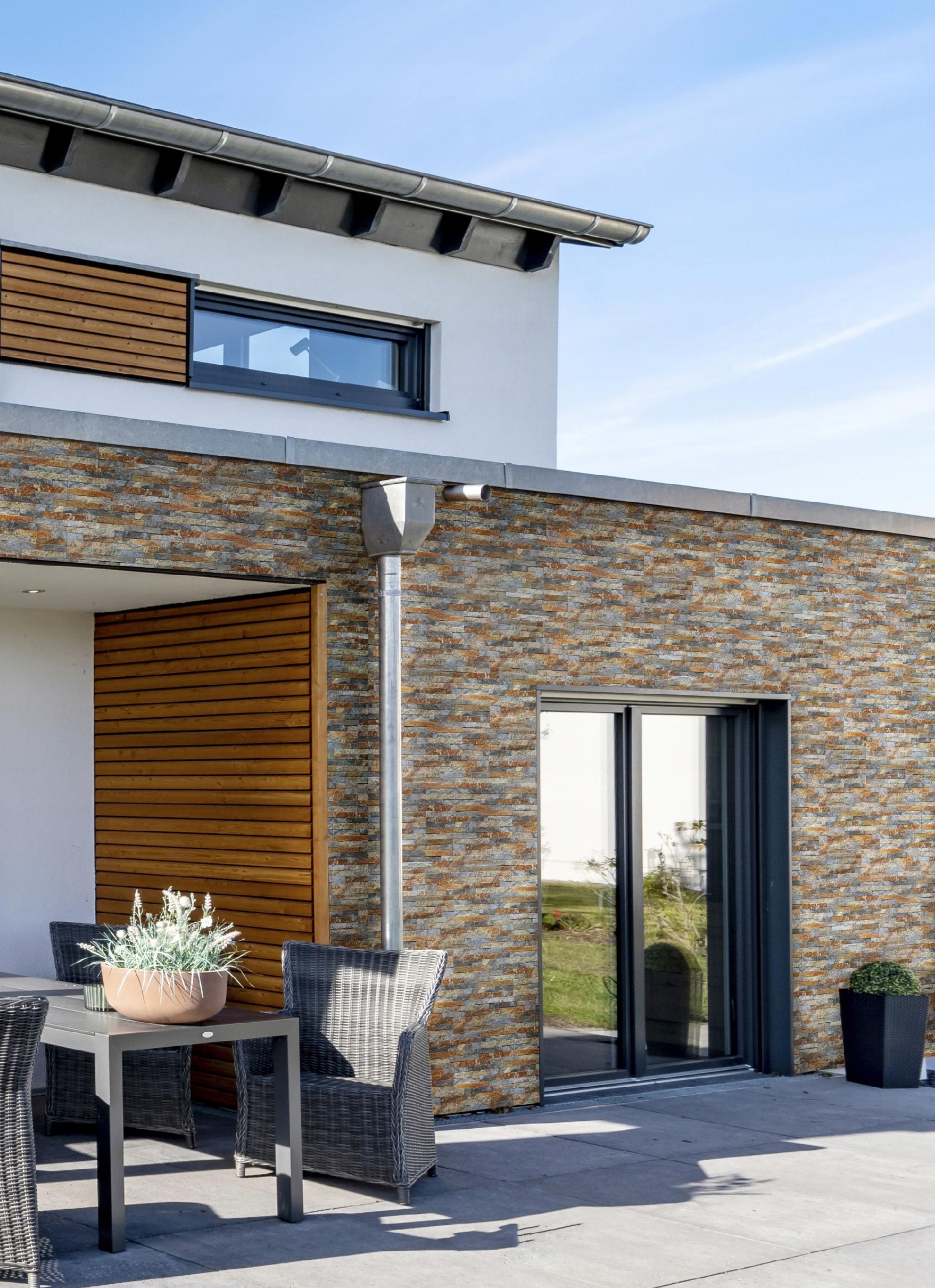Kamień elewacyjny dekoracyjny Mont Blanc Ruggine to nowoczesne rozwiązanie, które łączy w sobie elegancki design oraz trwałość. Jego geometrzyczna struktura i surowa faktura przypominająca łupek, nadają każdemu wnętrzu i elewacji niepowtarzalnego charakteru.