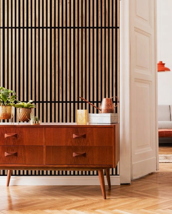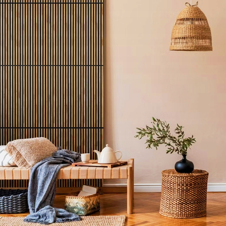 Nasze lamele ścienne, osadzone na czarnym podkładzie filcowym, to nie tylko estetyczny element wystroju, ale także sposób na praktyczne udoskonalenie każdego pomieszczenia. Dzięki ich zastosowaniu zyskasz: