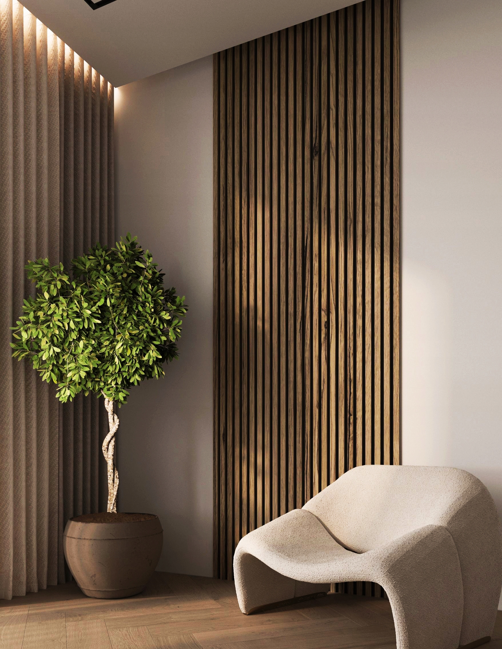 - Nowoczesny design – pionowe profile w połączeniu z eleganckim filcem tworzą efekt 3D, który wizualnie powiększa przestrzeń.