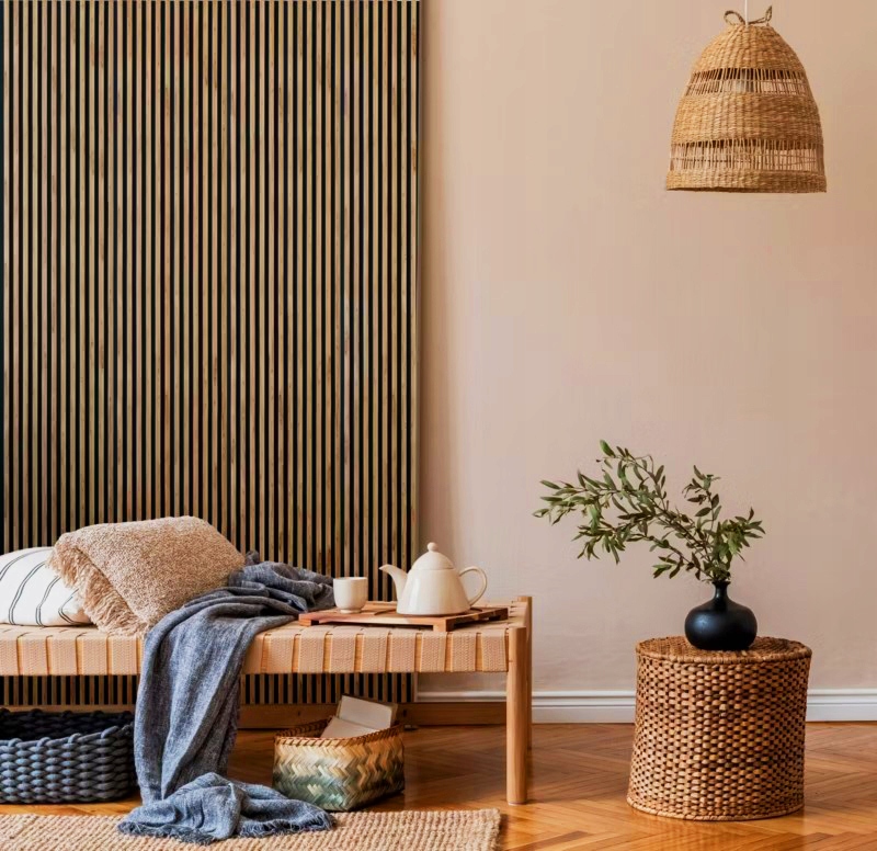 Lamele wykonane z wysokiej jakości płyty MDF osadzone są na miękkim czarnym filcu, co nie tylko wpływa na ich atrakcyjny wygląd, ale także skutecznie redukuje hałas oraz echo. Dzięki zastosowaniu takich paneli, każde pomieszczenie zyskuje na akustyce, co jest szczególnie istotne w biurach, salach konferencyjnych oraz w domowych strefach wypoczynkowych.